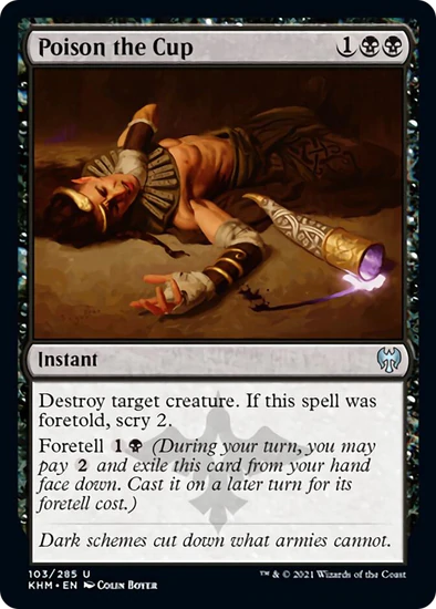 Destroy target creature. If this spell was foretold, scry 2. Foretell 1B (During your turn, you may pay 2 and exile this card from your hand face down. Cast it on a later turn for its foretell cost.)